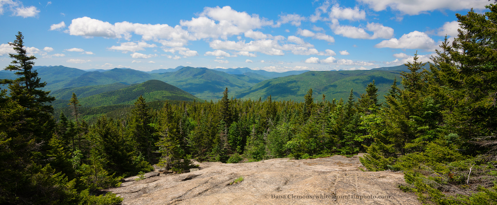 A terrific view from a south facing ledge in Crawford Notch. Close mountains include Carrigain, Chocorua, and the Hancocks, with further mountains of Osceola, the Tripyramids, and Tecumseh visible (amongst others).