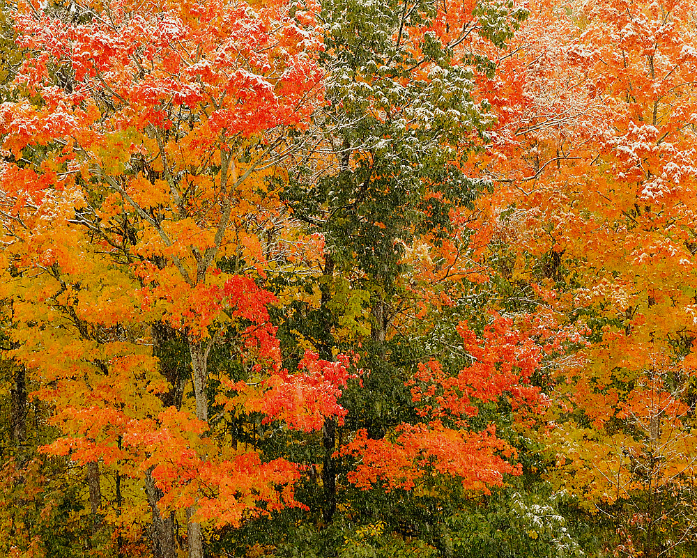 An early snow in in Jackson, during peak foliage. If you look closely, you can see the snow streaking through the image, as I was photographing.