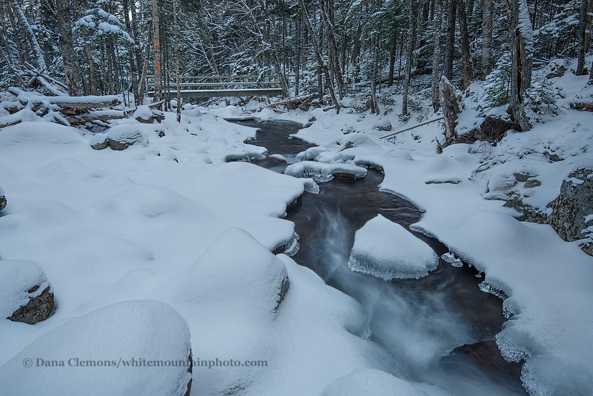 Starting before dawn, I drove up through Crawford Notch and headed to the Cog Road to explore some areas I had been to before, but was waiting for a fresh snow, and some unfrozen streams. I hiked the Jewell to the small foot bridge that crosses the stream, and attempted to scramble down the embankment, without falling into the cold water (8 degrees this morning). All the while, making sure to not leave footprints in the fresh snow, that I would be photographing.
