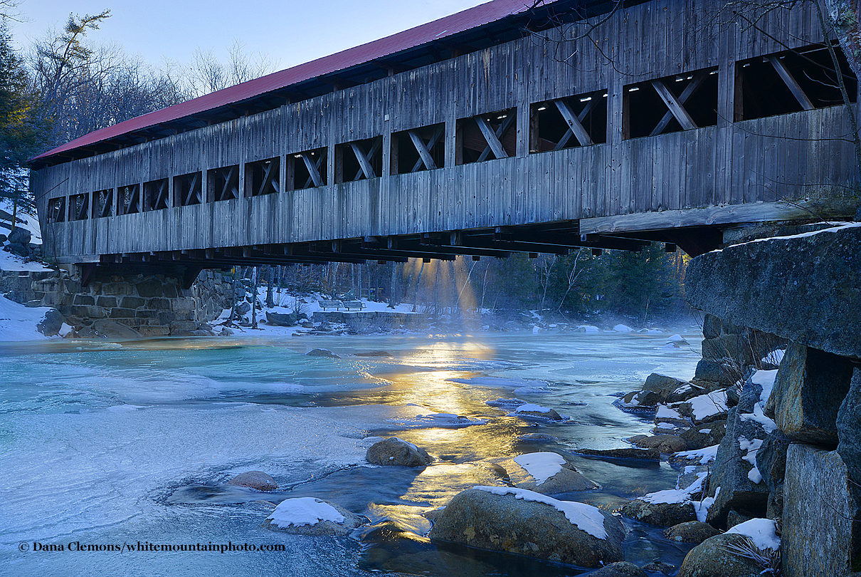 Those that know me, are well aware winter is my favorite season, that I love the snow and the crisp cold air:)! I must admit however, as I get older, it's getting harder to get out of my warm toasty bed at 4:45am, knowing it's well below zero, to go out and photograph.....yet I am always happy I did, once I'm outside in the elements:). Here's a pic taken this morning of the Albany Covered Bridge, along the Kancamagus Highway, as the sun was shining through, illuminating the steam rising from the Swift River. -7 degrees F. |